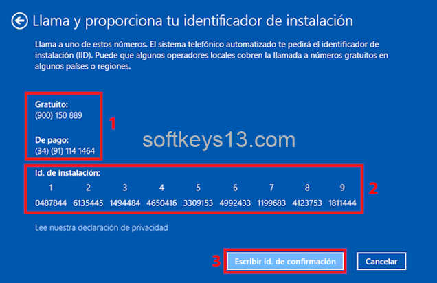 NOTA OPCIONAL: Si lo deseas, nosotros hacemos la llamada por ti, solo envíanos tu ID de instalación por el mismo medio por el que nos compraste la clave y en 5 minutos te damos tu código de confirmación. El código debe ser enviado en texto, no foto.